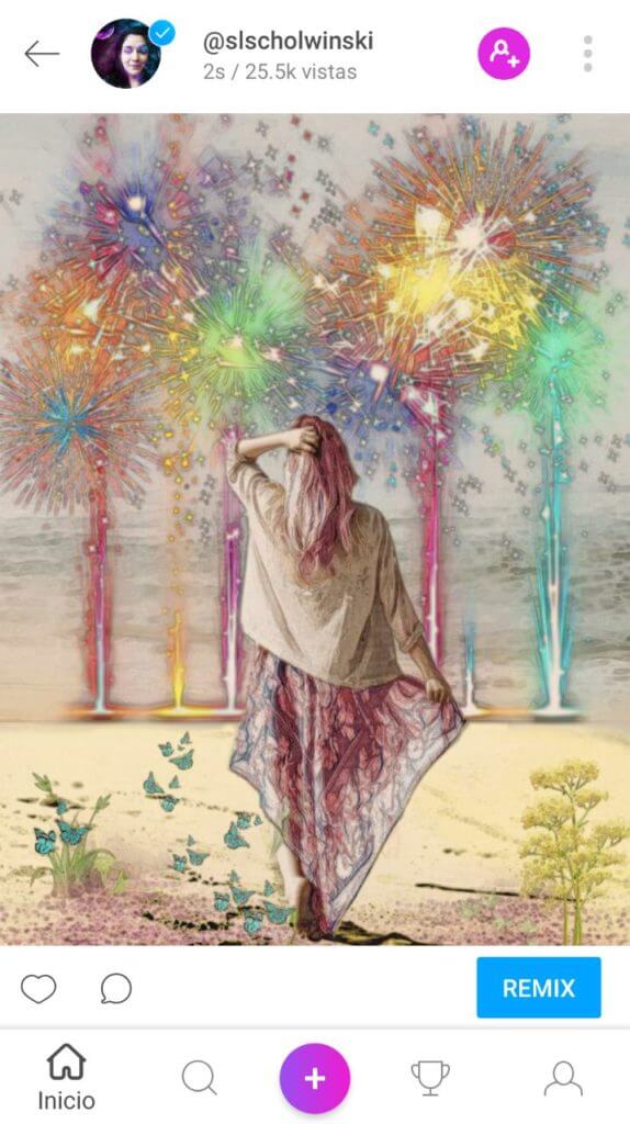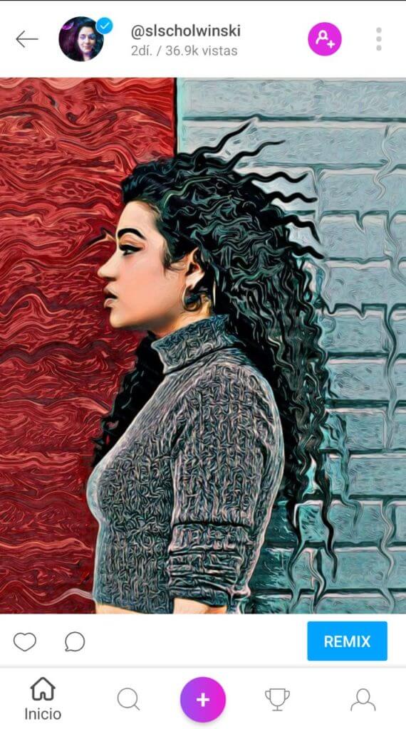 En la pantalla inicial encontrarás la parte más social de esta aplicación, muy similar a Instagram. Verás recomendaciones hechas para ti según tu gustos, los replay (paso a paso de la creación de una imagen y las herramientas utilizadas) de otros usuarios y los desafíos activos creados por la propia aplicación de Picsart.
